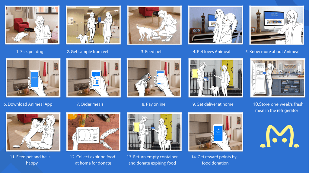 To bring the concept of Animeal’s innovative approach to life, we’ve crafted a storyboard that captures the essence of the company’s mission: reducing food waste and providing sustainable pet nutrition. This visual representation follows the journey of surplus food, from its origins in local retailers and food banks, to its transformation into nutritious meals for pets. By illustrating the core processes—sourcing, sorting, cooking, and packaging—our storyboard emphasizes Animeal’s commitment to sustainability and the circular economy, while also highlighting the technological innovations that make it all possible. Let’s take a closer look at how these ideas come to life on screen.