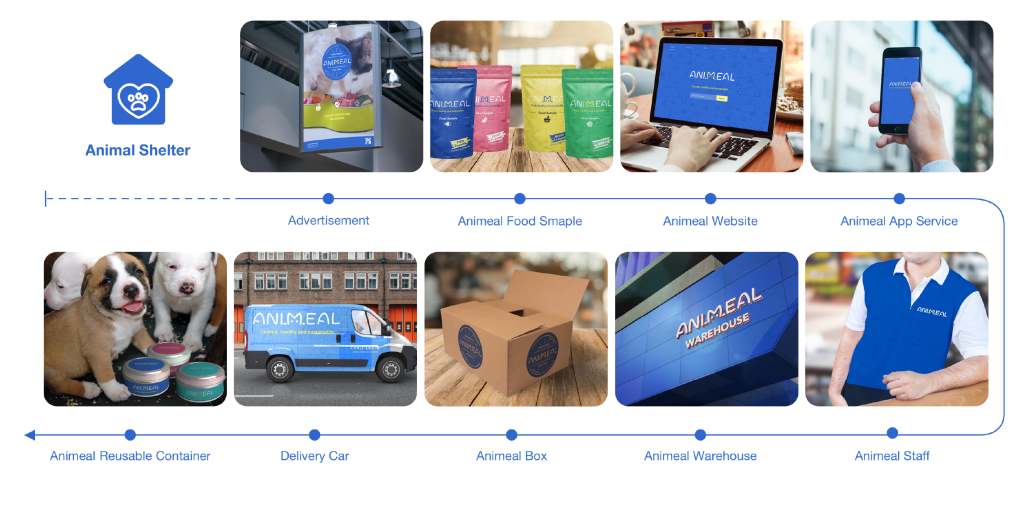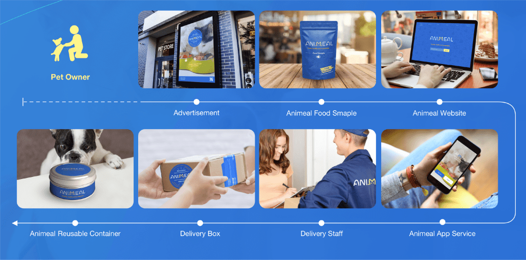 Animeal engages with its users through multiple touchpoints that enhance both the customer experience and its sustainability mission. From the initial discovery of the brand, potential customers can learn about Animeal’s values and offerings through its website and social media channels, where educational content on food waste and sustainability is shared. Once users decide to try the service, they interact with the easy-to-navigate app, which not only allows them to place orders but also provides valuable information on pet nutrition and eco-friendly practices. During the purchasing process, real-time delivery tracking ensures a seamless experience, while customer support is available at every stage to assist with inquiries. After the purchase, the app continues to engage users by offering personalized recipes, impact tracking, and insights into how their choices contribute to reducing waste. By maintaining consistent and informative touchpoints, Animeal ensures that its users feel connected, informed, and empowered throughout their journey.