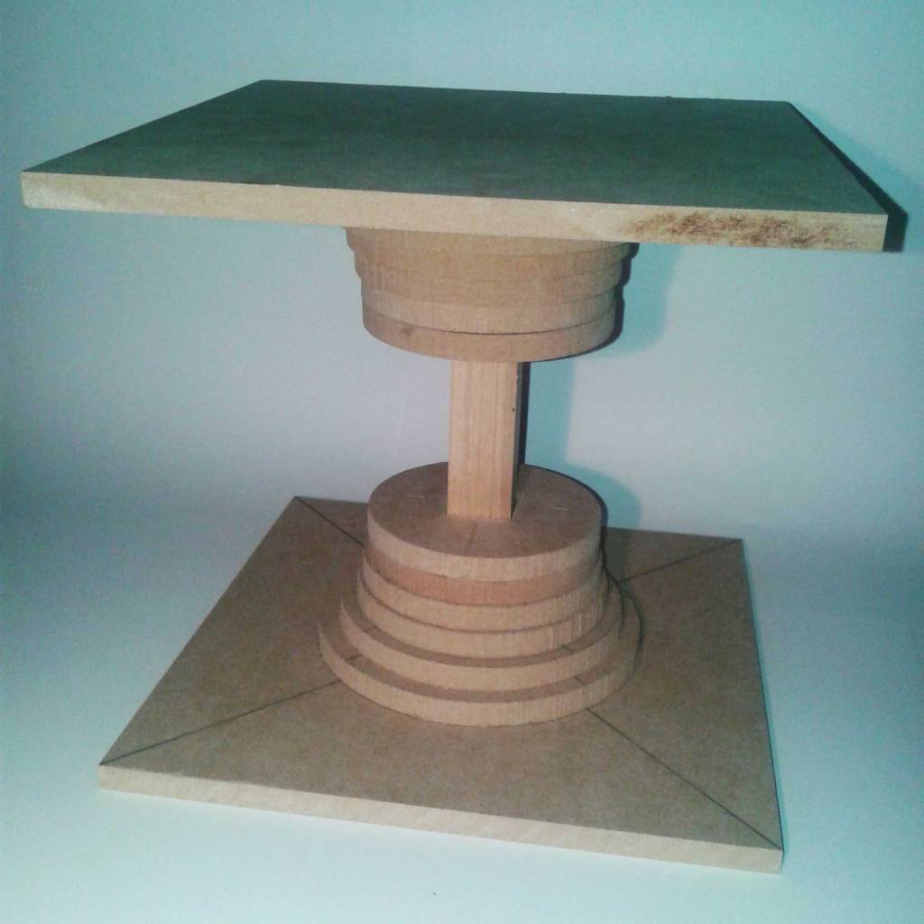I. The support consists of a cylindrical structure with discs of varying sizes placed on top. This design ensures stability and evenly distributes weight and varying disc sizes. The structure provides essential support during assembly and contributes to the overall aesthetic.