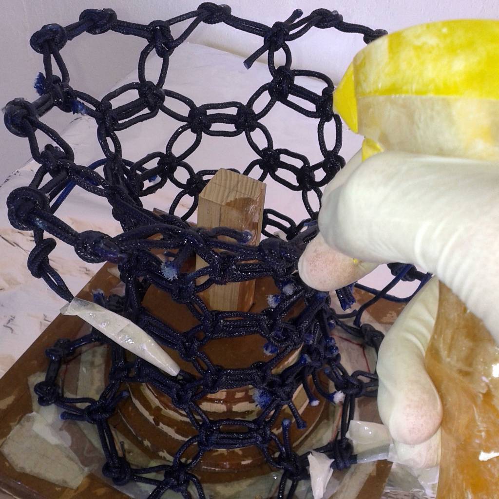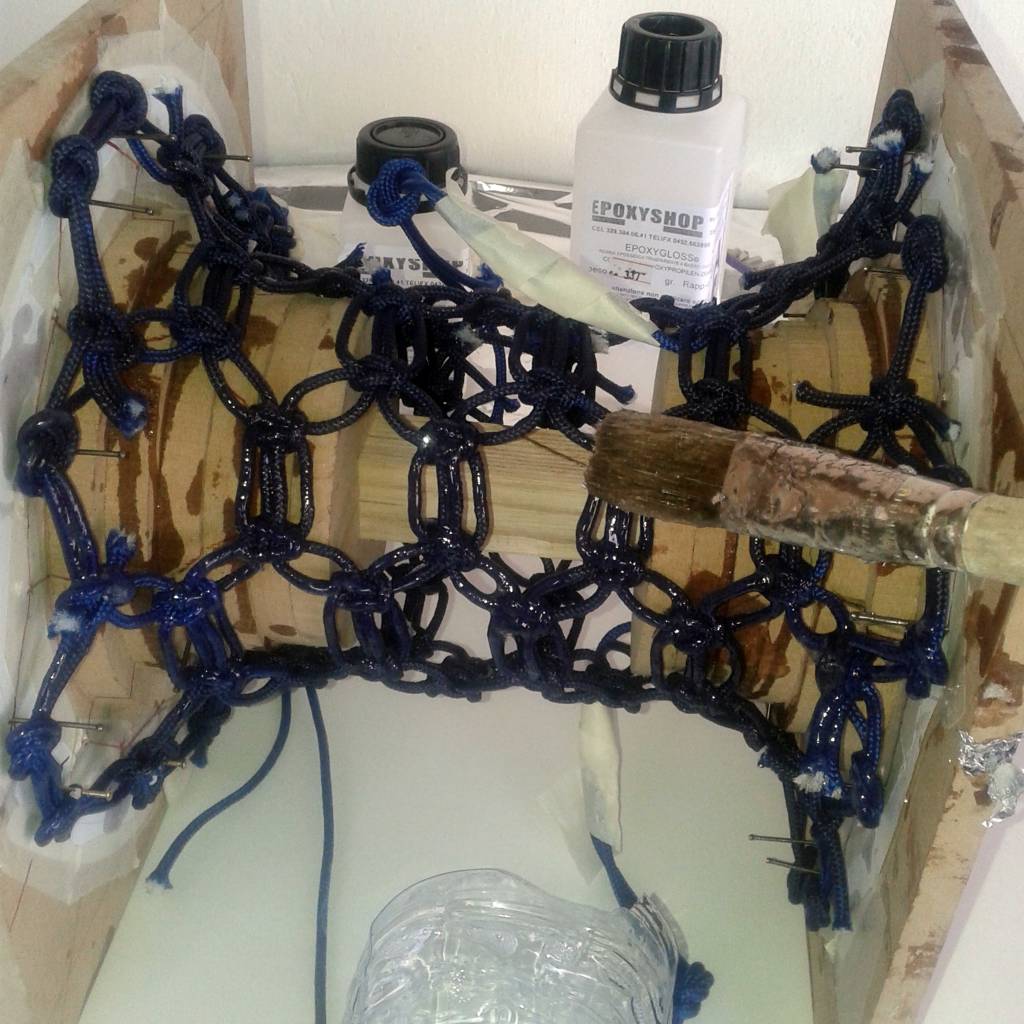 The epoxy resin is applied in two stages: first, it is used to bond the rope structure, and then a final layer is added to fully encapsulate and strengthen it, ensuring durability and a smooth finish.