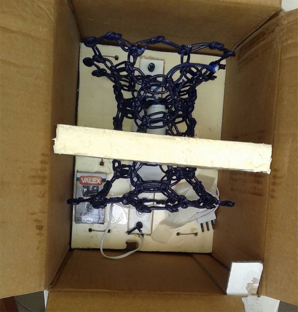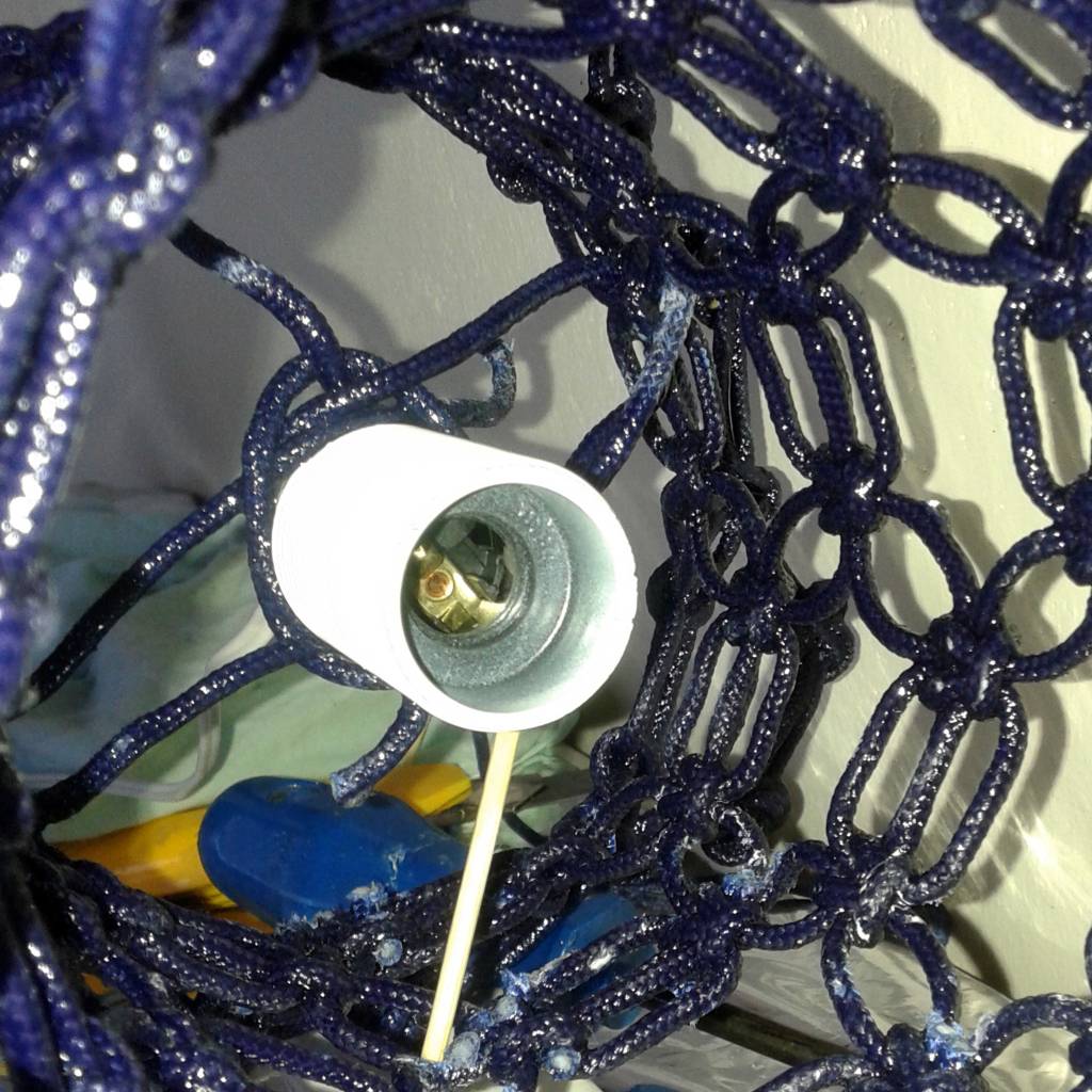 Once the resin has hardened, the wooden support is removed, and any excess rope is trimmed. Next, a support for the lamp holder is created using two pieces of rope folded onto themselves and soaked in epoxy resin for added strength. At the same time, the electrical system is installed, ensuring that all components are securely in place and functional. This process combines both craftsmanship and technical expertise, resulting in a fully assembled, durable, and functional lighting fixture.