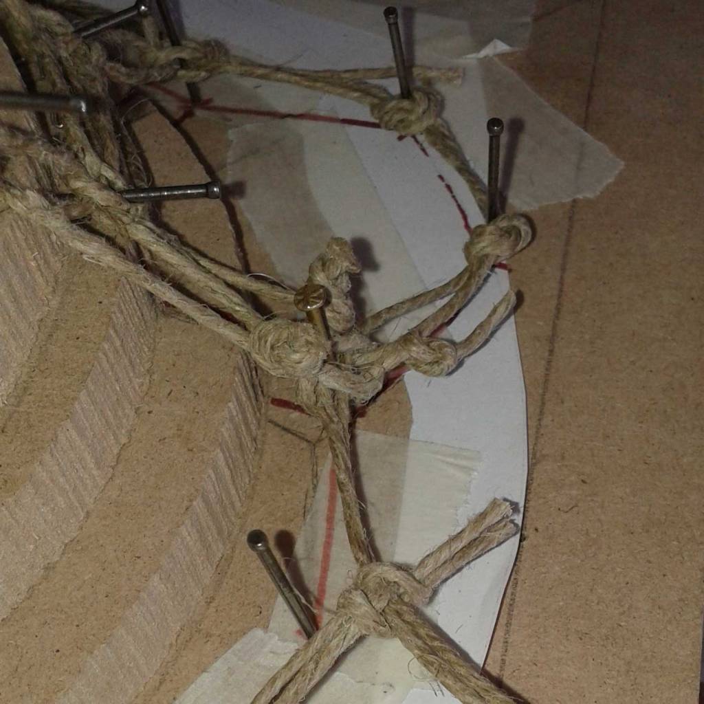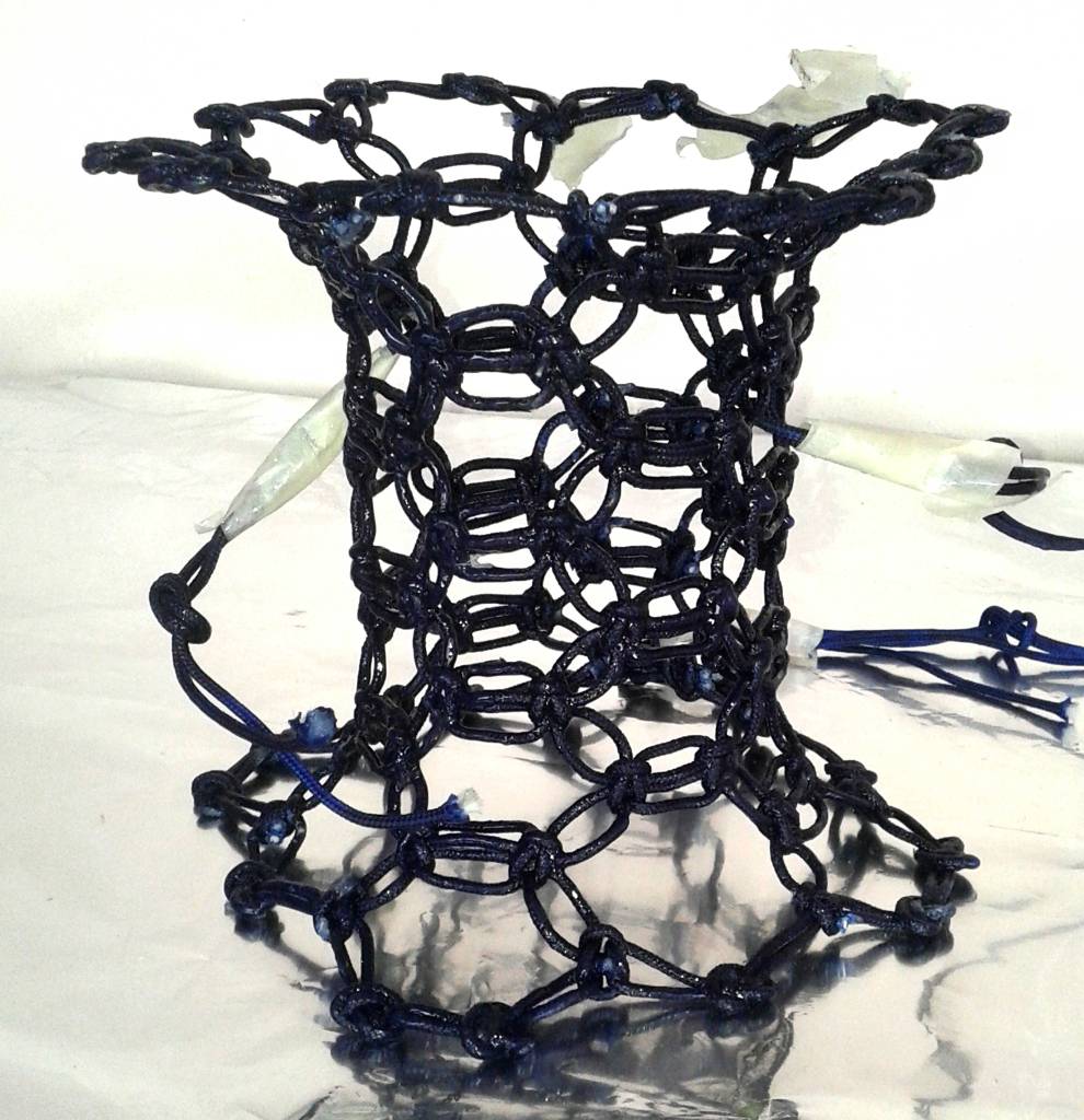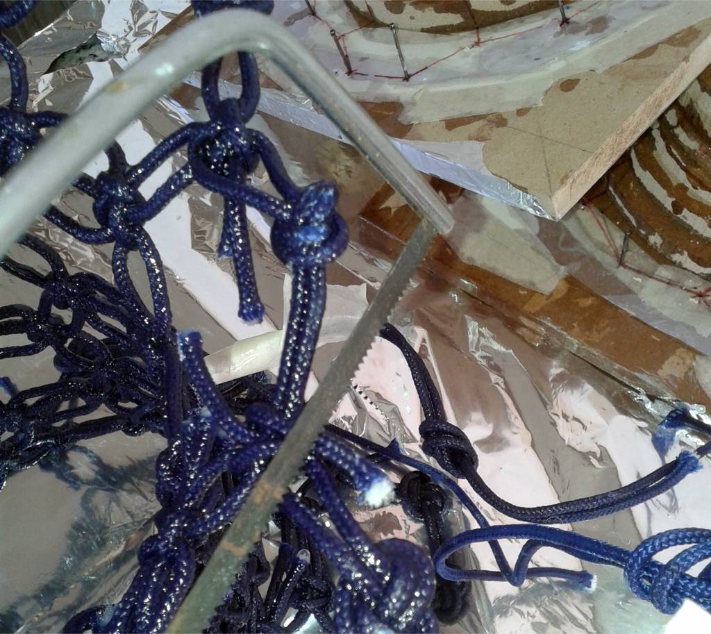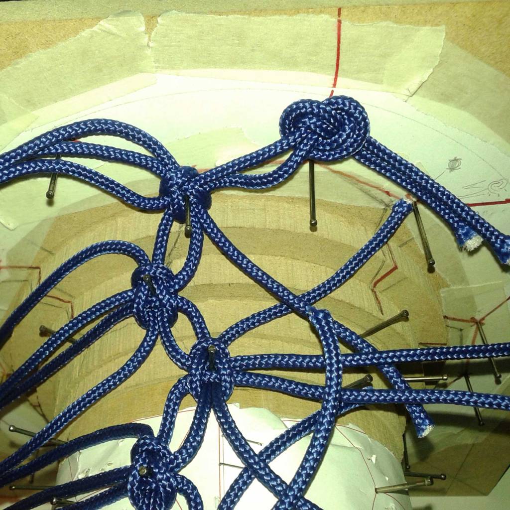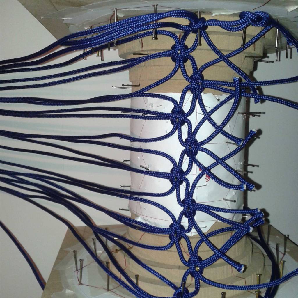 Before the actual weaving process began (blue thread), a trial weaving with string was conducted to precisely identify the points where the knots would be placed. This step allowed for a detailed assessment of the structure and helped to ensure that the knots were positioned accurately for both aesthetic appeal and functionality. By using string as a prototype, it was possible to experiment with different patterns and tension levels, ensuring that the final woven structure would be both stable and visually balanced. This preliminary phase was essential in refining the design, allowing for adjustments before committing to the final weaving with the chosen material.