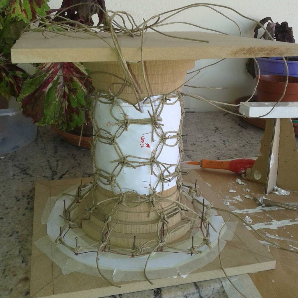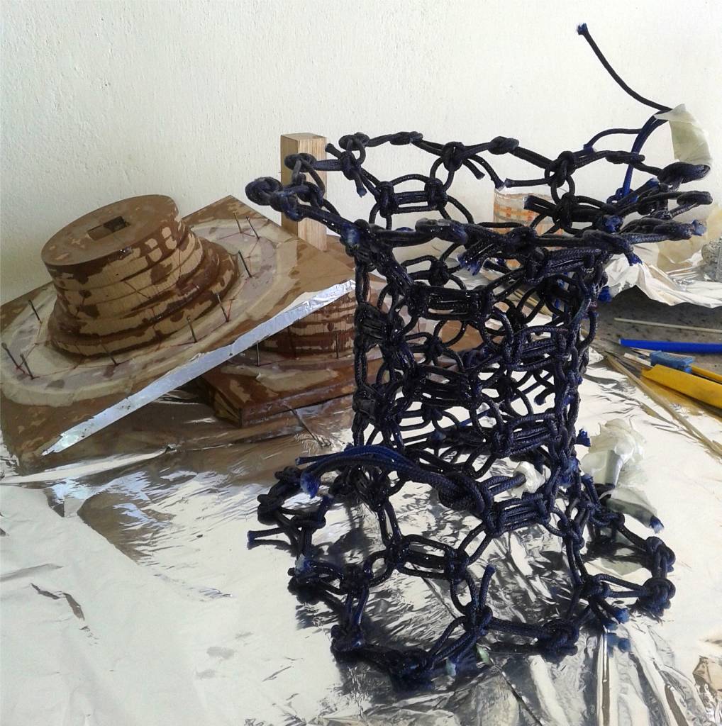 The wooden support for the rope weaving had to have a fundamental characteristic: it needed to be made of interlocking parts that could be easily disassembled once the epoxy resin had dried. This design was crucial to allow the woven structure to maintain its shape while the resin solidified, ensuring the integrity and durability of the final product. The support structure had to be both functional and practical, providing the necessary support during the weaving process but also allowing for removal without damaging the rope or resin. Of the two proposed structures, the second option was selected as it best met these requirements, offering a reliable and efficient solution for the assembly and disassembly process. This decision ensured that the object could be completed seamlessly, with all components fitting together perfectly after the resin had cured.